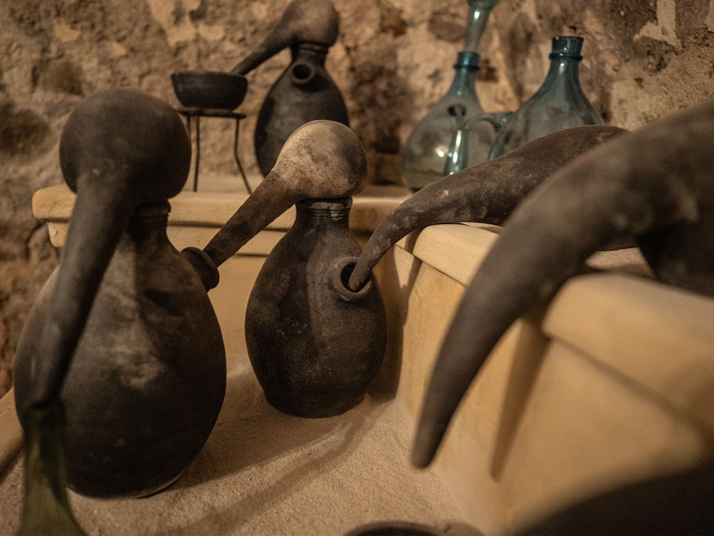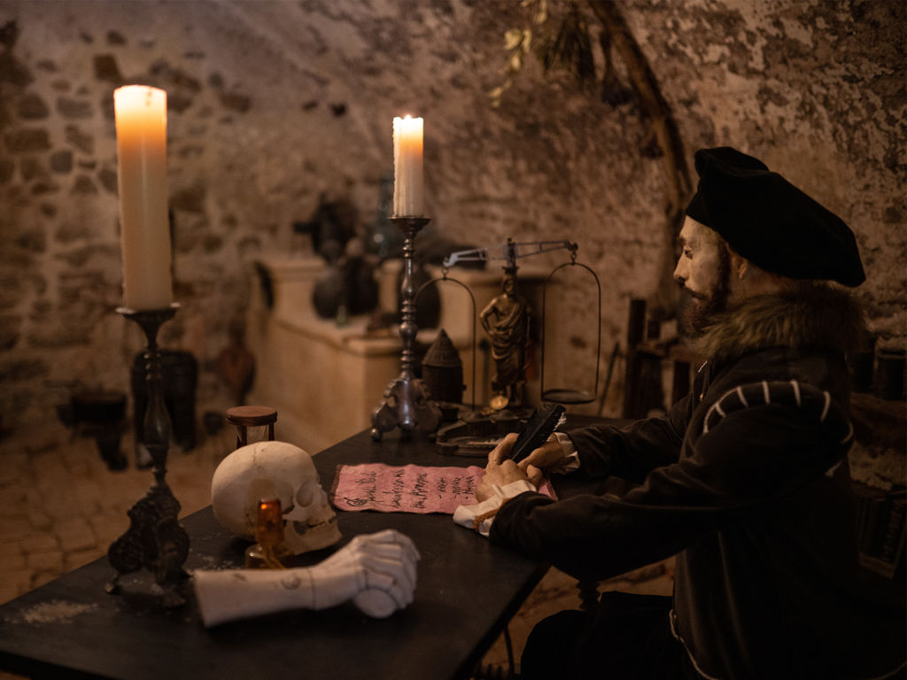 Jedinečná expozice alchymistické laboratoře Mistra Bonaciny Vás taktéž zavede do sklepních prostor, kde se seznámíte s jeho tajuplnou pracovnou. Uvedeme vás do tajů renesanční alchymie a nástrojů praktické alchymie – poznáte křivule, alembiky, athanory, dózy, tavící pece, ale také vhlédnete do bohaté alchymistické a astrologické symboliky.